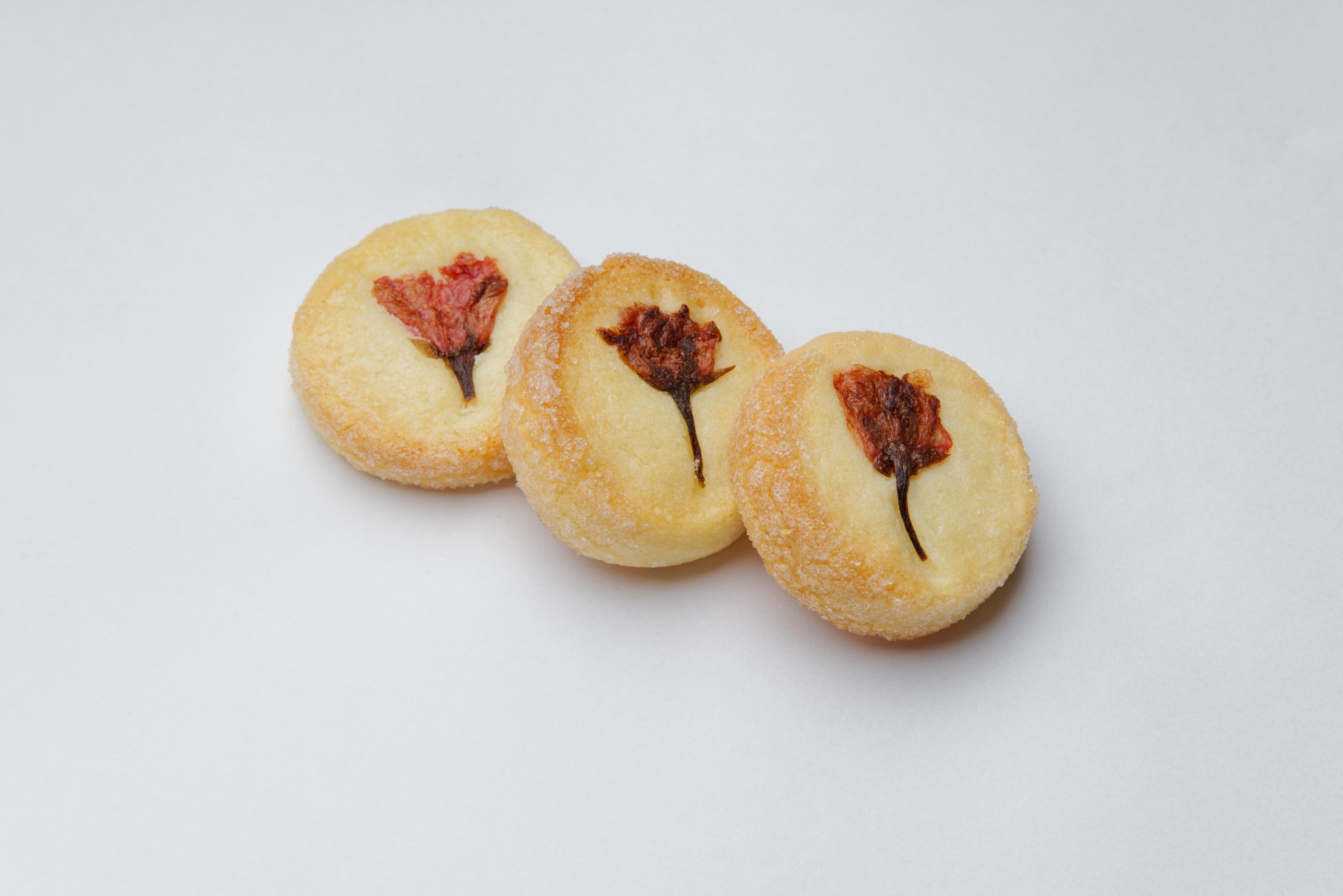 春限定のサブレです。サクサクしたクッキーに桜の塩漬けをのせて焼き上げました。
